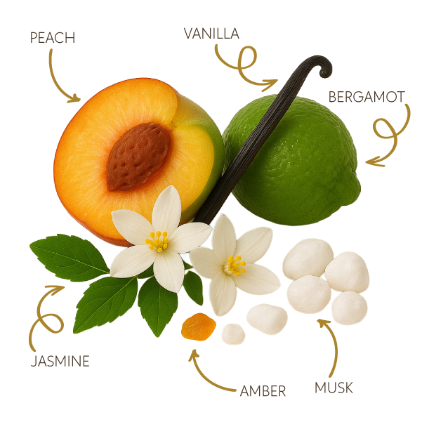 Fragrance Oil Ingredients: Peach – Bergamot – Jasmine – Vanilla – Musk – Amber