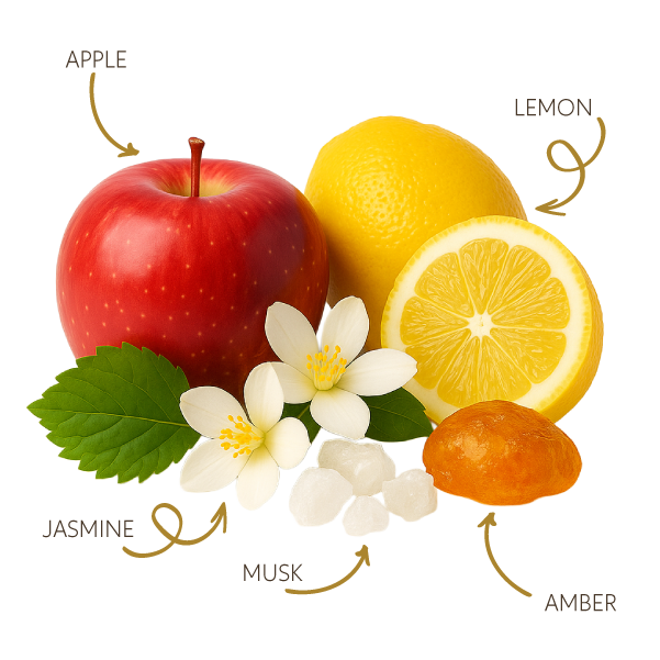 A refreshing fragrance blend that radiates purity and vitality. It combines the soft touch of white musk with the warmth of amber, brightened by notes of lemon and apple, and enhanced with delicate feminine floral accords. This scent refreshes your space and adds a lasting sense of sophistication and freshness throughout the day.