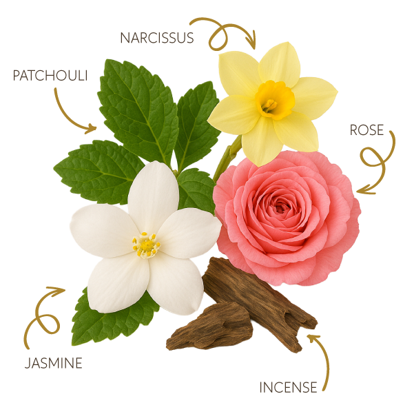 Fragrance Ingredients: Patchouli – Jasmine – Rose – Incense – Narcissus